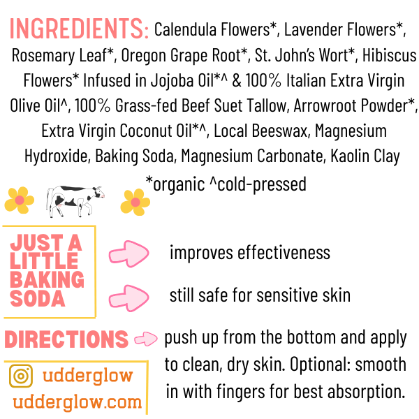 Calendula Flowers*, Lavender Flowers*, Rosemary Leaf*, Oregon Grape Root*, St John's Wort*, Hibiscus Flowers*, infused in Jojoba Oil*^ & 100% Italian Extra Virgin Olive Oil^, 100% Grass-Fed Suet Tallow, Arrowroot Powder*, Extra Virgin Coconut Oil*^, Magnesium Hydroxide, Local Beeswax, Baking Soda, Magnesium Carbonate, Kaolin Clay